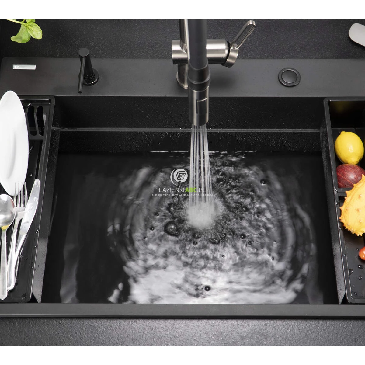 Bateria posiada magnetyczny uchwyt na wylewkę, co ułatwia jej szybkie odłożenie po użyciu. To rozwiązanie zapewnia wygodę oraz elegancki wygląd kuchni.