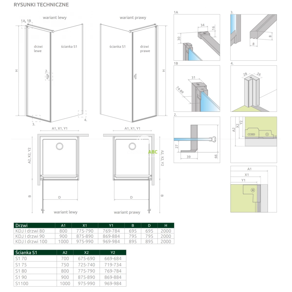 Uwaga! Wymiar kabiny dopasowany jest do montażu na brodziku o standardowym rozmiarze. W rzeczywistości kabina jest mniejsza. Jeśli planujesz montaż kabiny bezpośrednio na posadzce, zwróć uwagę na wymiary do osi szyby (Y1, Y2).