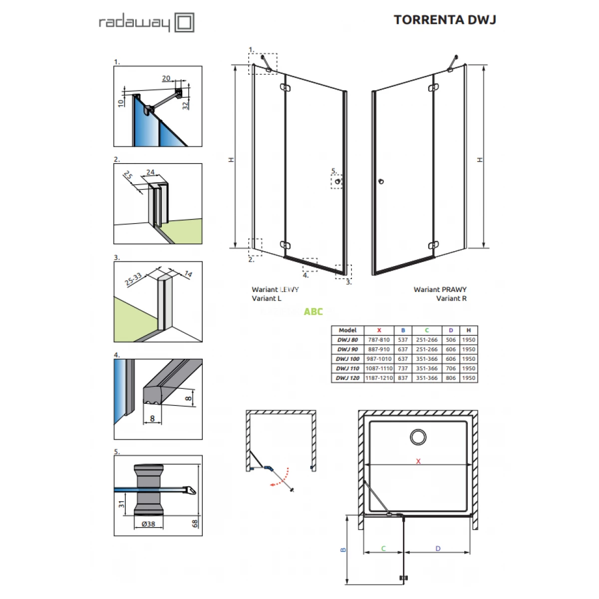 Uwaga! Wymiar kabiny dopasowany jest do montażu na brodziku o standardowym rozmiarze. W rzeczywistości kabina jest mniejsza. Jeśli planujesz montaż kabiny bezpośrednio na posadzce, zwróć uwagę na wymiary do osi szyby (Y1, Y2).