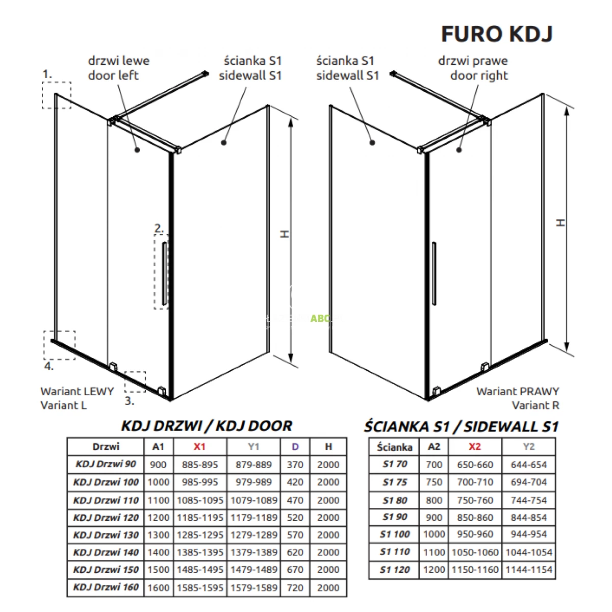 Uwaga! Wymiar kabiny dopasowany jest do montażu na brodziku o standardowym rozmiarze. W rzeczywistości kabina jest mniejsza. Jeśli planujesz montaż kabiny bezpośrednio na posadzce, zwróć uwagę na wymiary do osi szyby (Y1, Y2).