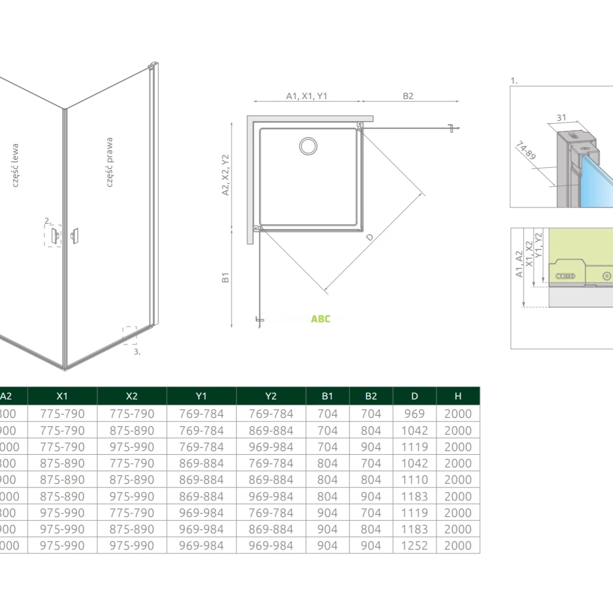 Uwaga! Wymiar kabiny dopasowany jest do montażu na brodziku o standardowym rozmiarze. W rzeczywistości kabina jest mniejsza. Jeśli planujesz montaż kabiny bezpośrednio na posadzce, zwróć uwagę na wymiary do osi szyby (Y1, Y2).