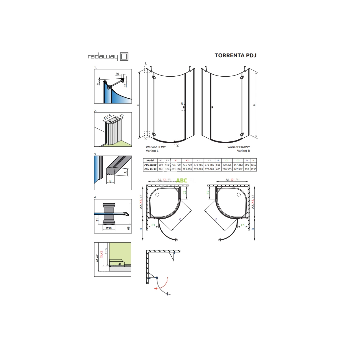 Uwaga! Wymiar kabiny dopasowany jest do montażu na brodziku o standardowym rozmiarze. W rzeczywistości kabina jest mniejsza. Jeśli planujesz montaż kabiny bezpośrednio na posadzce, zwróć uwagę na wymiary do osi szyby (Y1, Y2).