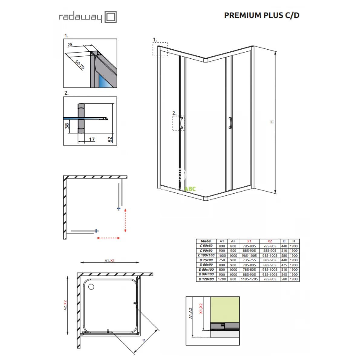 Uwaga! Wymiar kabiny dopasowany jest do montażu na brodziku o standardowym rozmiarze. W rzeczywistości kabina jest mniejsza. Jeśli planujesz montaż kabiny bezpośrednio na posadzce, zwróć uwagę na wymiary do osi szyby (Y1, Y2).