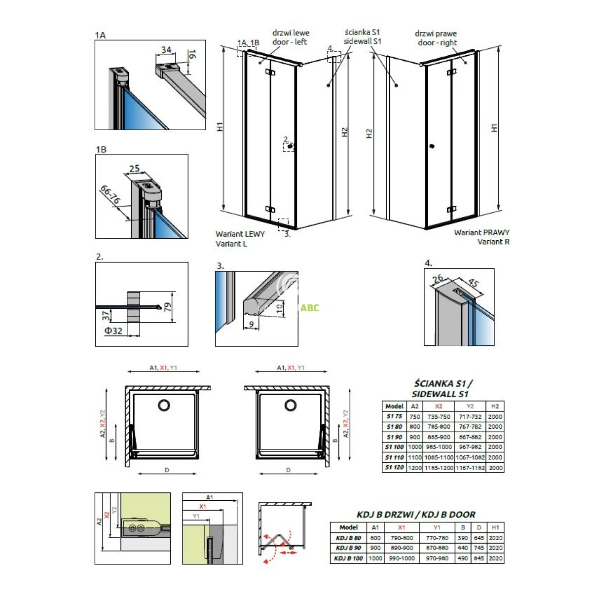 Uwaga! Wymiar kabiny dopasowany jest do montażu na brodziku o standardowym rozmiarze. W rzeczywistości kabina jest mniejsza. Jeśli planujesz montaż kabiny bezpośrednio na posadzce, zwróć uwagę na wymiary do osi szyby (Y1, Y2).