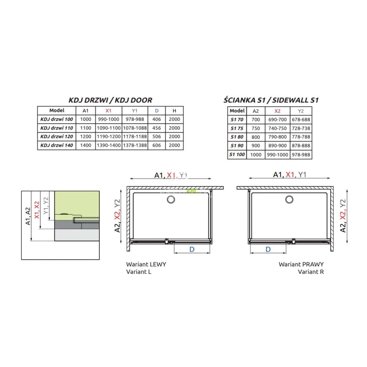 Uwaga! Wymiar kabiny dopasowany jest do montażu na brodziku o standardowym rozmiarze. W rzeczywistości kabina jest mniejsza. Jeśli planujesz montaż kabiny bezpośrednio na posadzce, zwróć uwagę na wymiary do osi szyby (Y1, Y2).