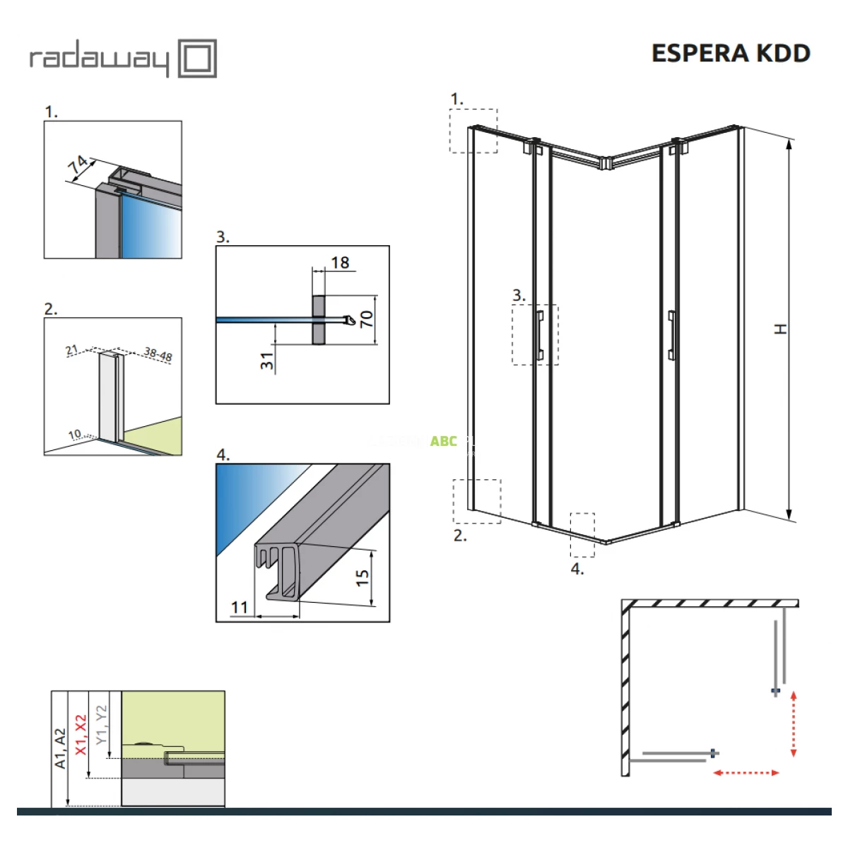 Uwaga! Wymiar kabiny dopasowany jest do montażu na brodziku o standardowym rozmiarze. W rzeczywistości kabina jest mniejsza. Jeśli planujesz montaż kabiny bezpośrednio na posadzce, zwróć uwagę na wymiary do osi szyby (Y1, Y2).
