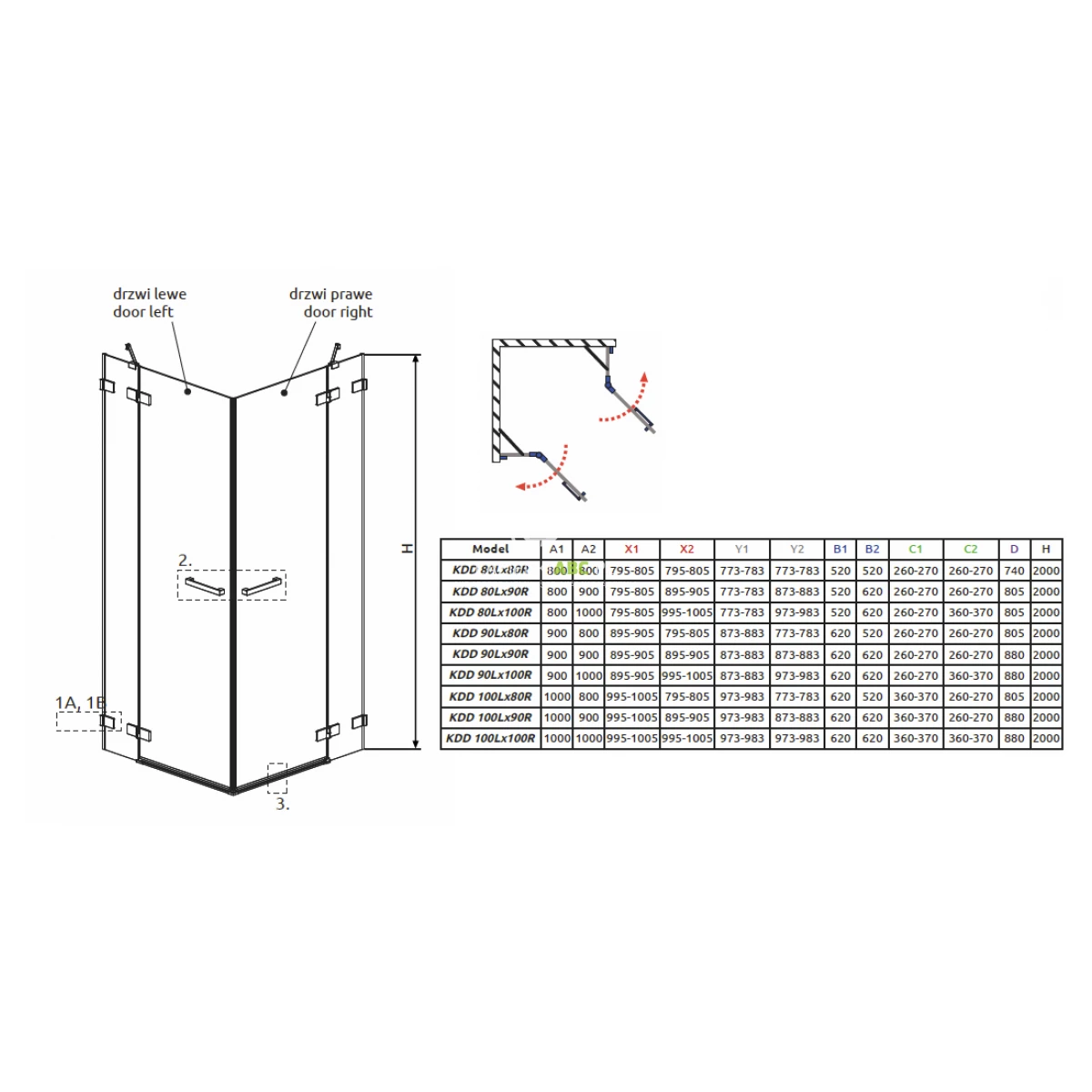 Uwaga! Wymiar kabiny dopasowany jest do montażu na brodziku o standardowym rozmiarze. W rzeczywistości kabina jest mniejsza. Jeśli planujesz montaż kabiny bezpośrednio na posadzce, zwróć uwagę na wymiary do osi szyby (Y1, Y2).