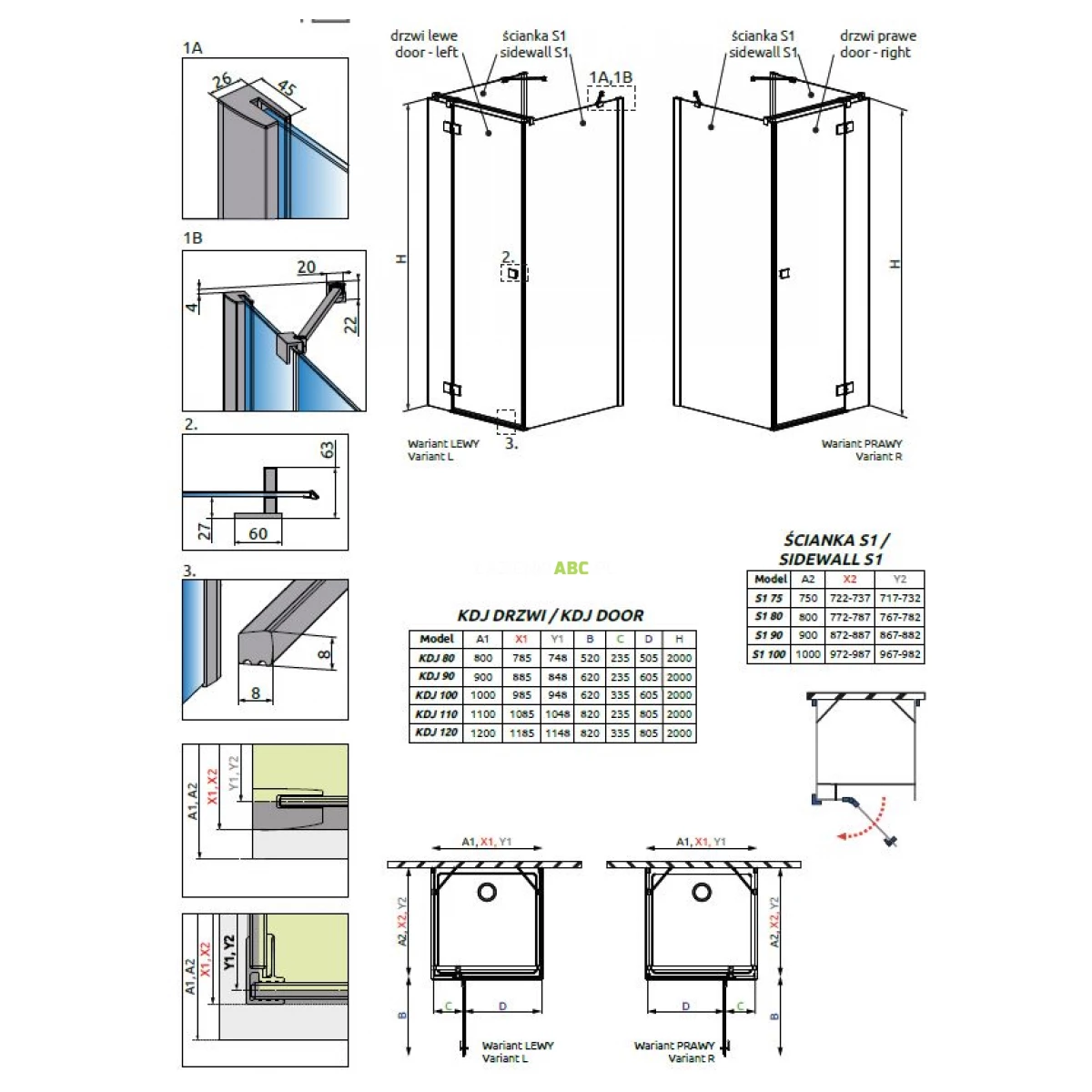 Uwaga! Wymiar kabiny dopasowany jest do montażu na brodziku o standardowym rozmiarze. W rzeczywistości kabina jest mniejsza. Jeśli planujesz montaż kabiny bezpośrednio na posadzce, zwróć uwagę na wymiary do osi szyby (Y1, Y2).