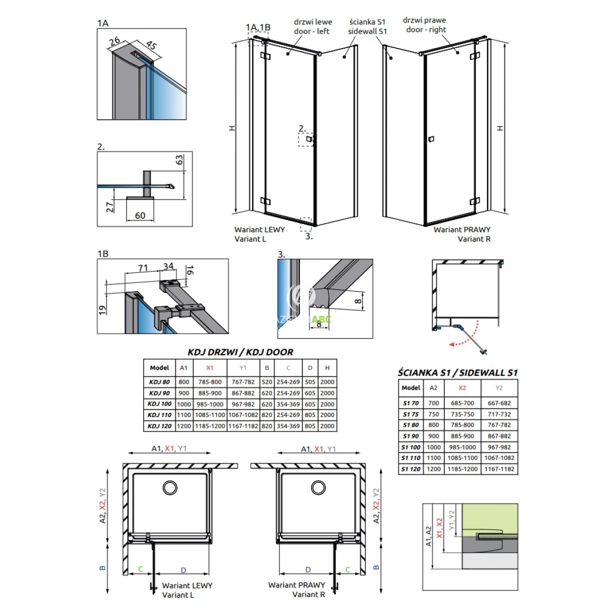 Uwaga! Wymiar kabiny dopasowany jest do montażu na brodziku o standardowym rozmiarze. W rzeczywistości kabina jest mniejsza. Jeśli planujesz montaż kabiny bezpośrednio na posadzce, zwróć uwagę na wymiary do osi szyby (Y1, Y2).