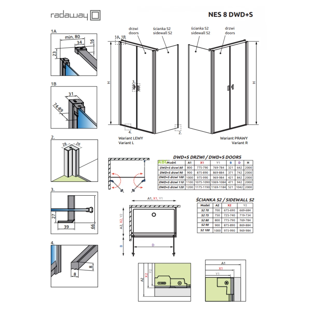Uwaga! Wymiar kabiny dopasowany jest do montażu na brodziku o standardowym rozmiarze. W rzeczywistości kabina jest mniejsza. Jeśli planujesz montaż kabiny bezpośrednio na posadzce, zwróć uwagę na wymiary do osi szyby (Y1, Y2).