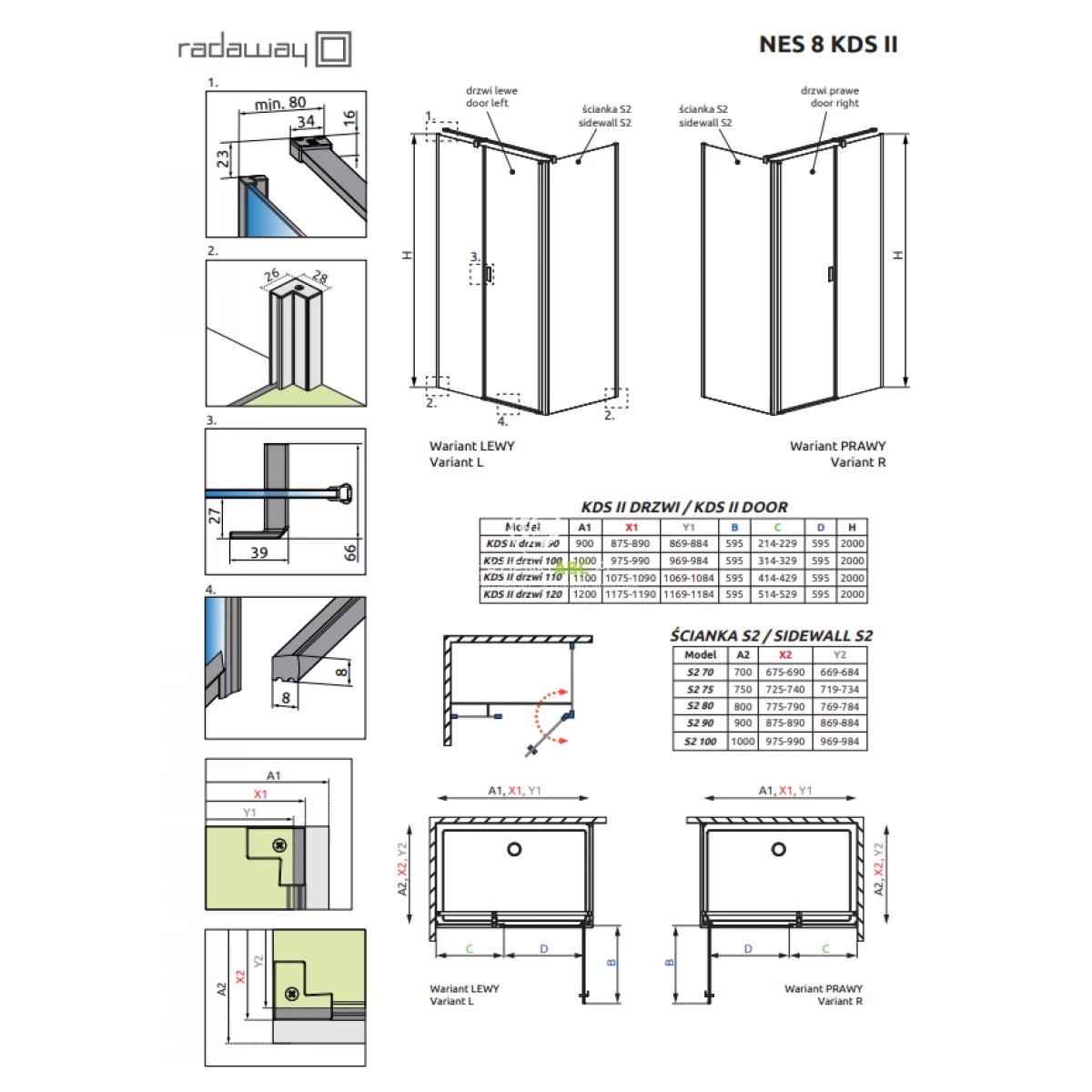 Uwaga! Wymiar kabiny dopasowany jest do montażu na brodziku o standardowym rozmiarze. W rzeczywistości kabina jest mniejsza. Jeśli planujesz montaż kabiny bezpośrednio na posadzce, zwróć uwagę na wymiary do osi szyby (Y1, Y2).