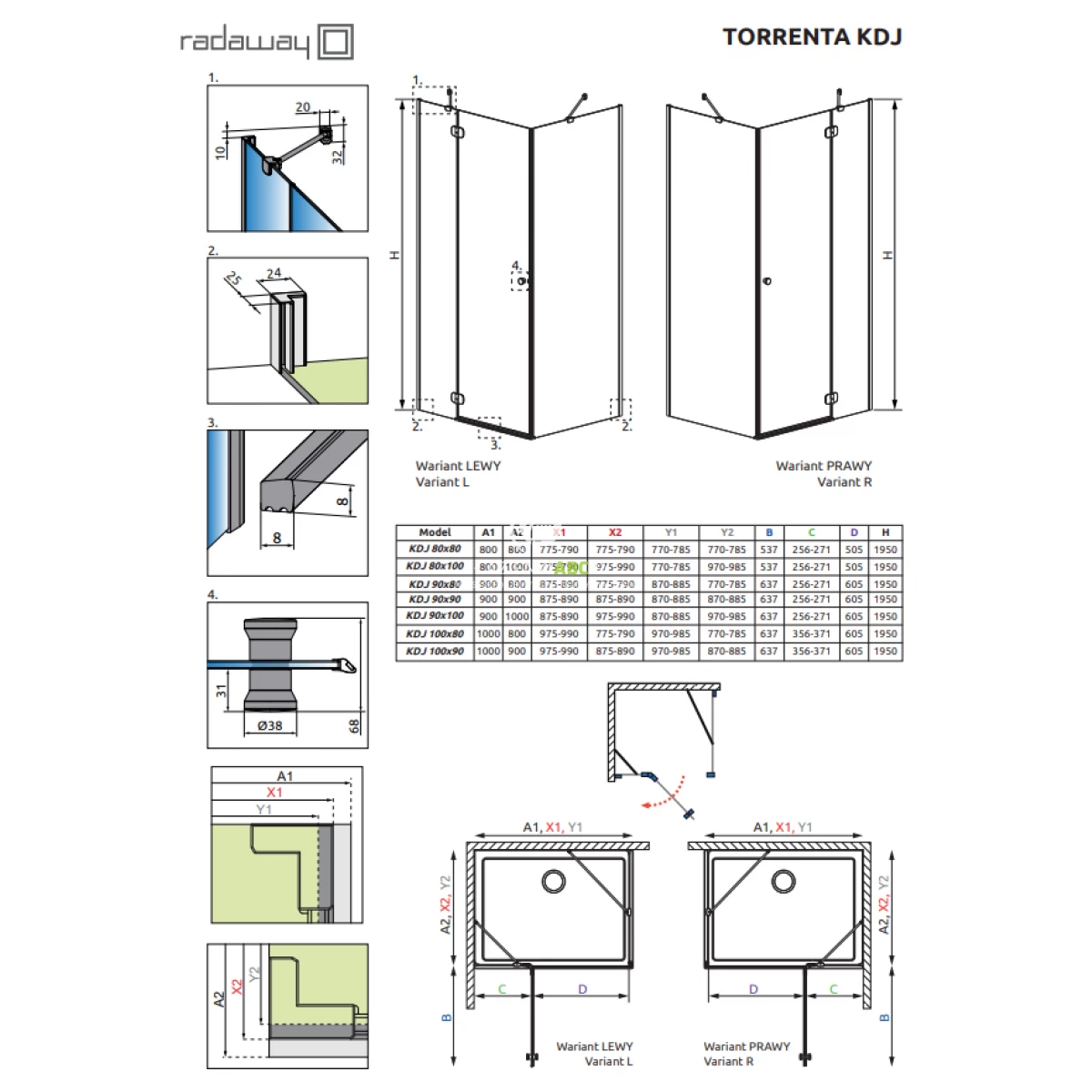 Uwaga! Wymiar kabiny dopasowany jest do montażu na brodziku o standardowym rozmiarze. W rzeczywistości kabina jest mniejsza. Jeśli planujesz montaż kabiny bezpośrednio na posadzce, zwróć uwagę na wymiary do osi szyby (Y1, Y2).