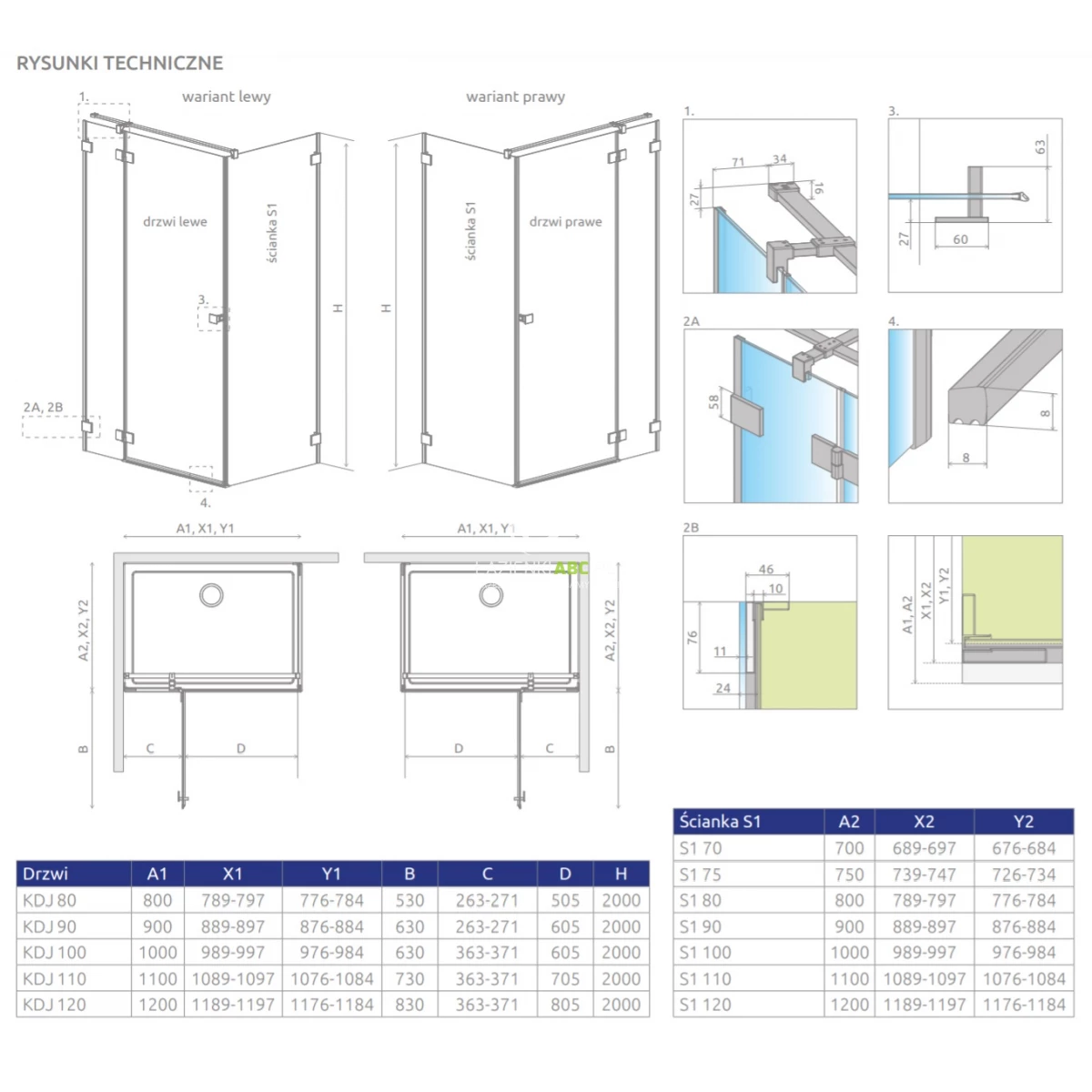 Uwaga! Wymiar kabiny dopasowany jest do montażu na brodziku o standardowym rozmiarze. W rzeczywistości kabina jest mniejsza. Jeśli planujesz montaż kabiny bezpośrednio na posadzce, zwróć uwagę na wymiary do osi szyby (Y1, Y2).