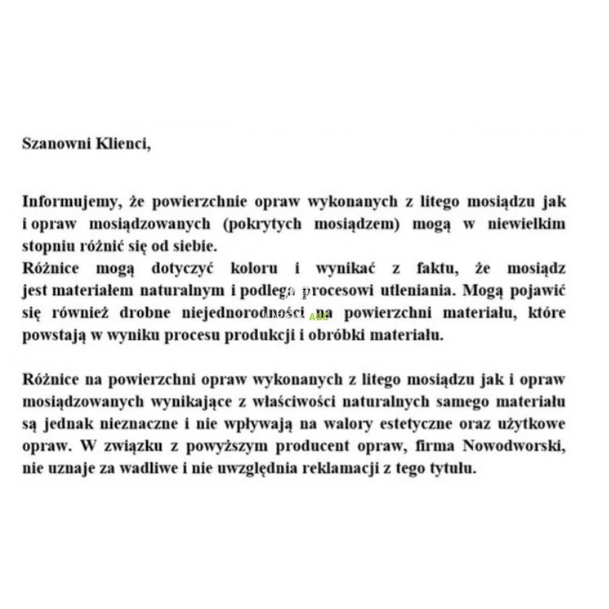 Powierzchnie opraw wykonanych z litego jak i opraw mosiądzowanych (pokrytych mosiądzem) mogą w niewielkim stopniu różnić się od siebie kolorem, ponieważ jest to materiał naturalny i podlega utlenianiu. Możliwe są również drobne niejednorodności na powierzchni metriału, powstające podczas procesów produkcji i obróbki. Wspomniane różnice są drobne i pozostają bez wpływu walory estetyczne i użytkowe produktów. W związku z tym nie uznaje się za wadliwe z tego powodu i nie uwzględnia reklamacji.