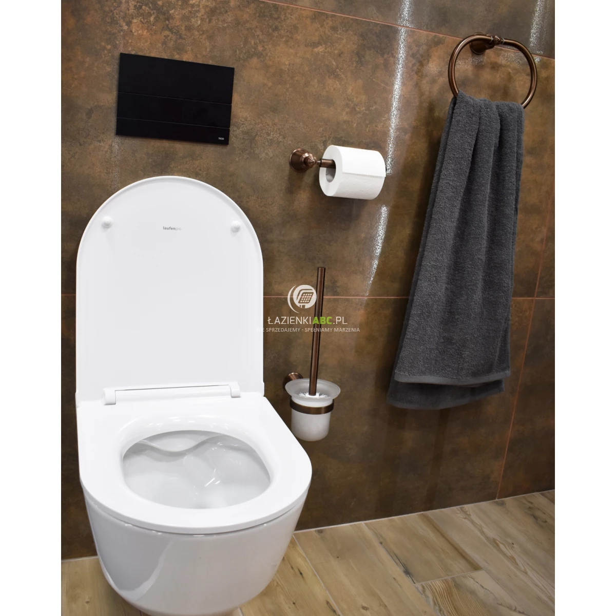 Miska WC Laufen nie posiada kołnierza wewnętrznego. Poza tym posiada pełne szkliwienie powierzchni, które mają kontakt z wodą. Brak widocznych mocowań ma wpływ na estetykę miski. Komplet WC sprzedawany jest razem z zestawem montażowym. Deska została wykonana z wyjątkowo trwałego materiału - Supralitu. Posiada metalowe zawiasy oraz system szybkiego wypinania, który umożliwia jej szybsze czyszczenie. Zachęcamy do zakupu.