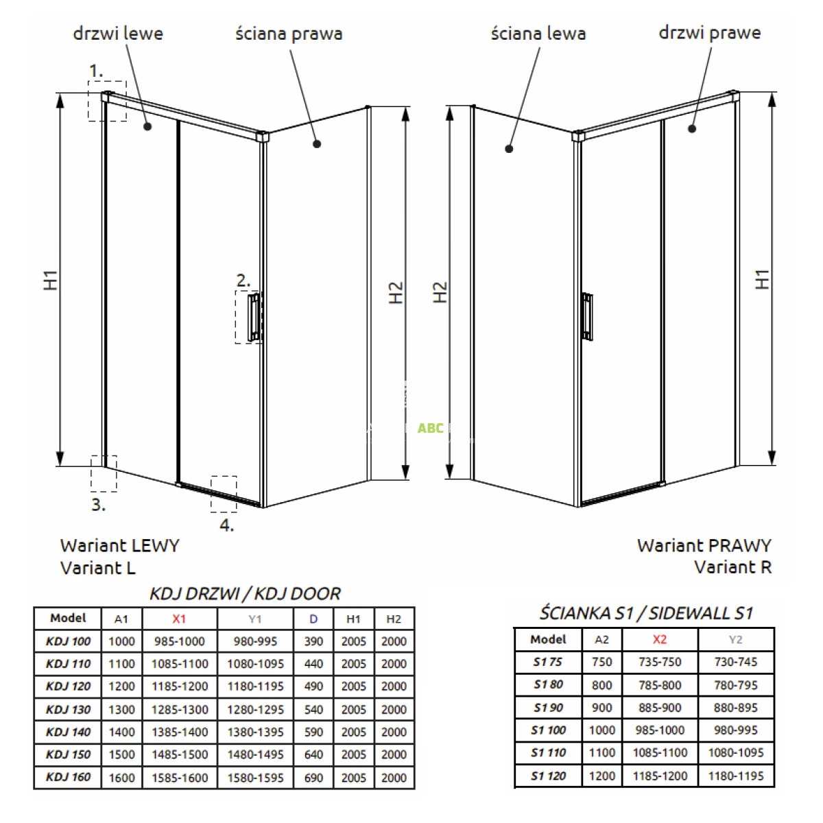Uwaga! Wymiar kabiny dopasowany jest do montażu na brodziku o standardowym rozmiarze. W rzeczywistości kabina jest mniejsza. Jeśli planujesz montaż kabiny bezpośrednio na posadzce, zwróć uwagę na wymiary do osi szyby (Y1, Y2).