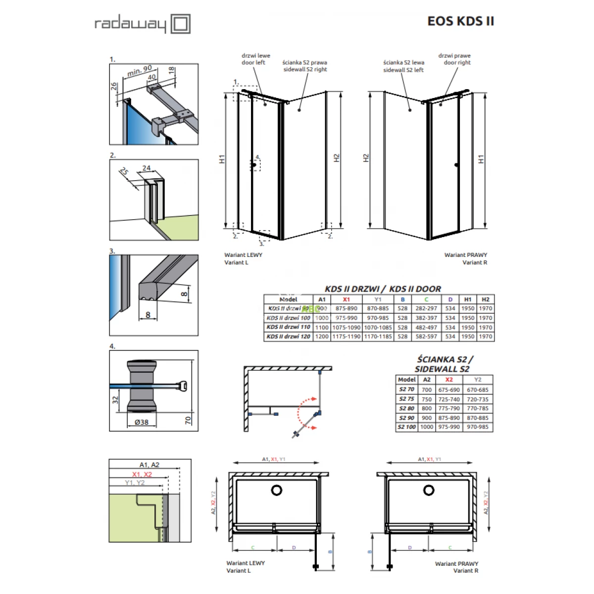 Uwaga! Wymiar kabiny dopasowany jest do montażu na brodziku o standardowym rozmiarze. W rzeczywistości kabina jest mniejsza. Jeśli planujesz montaż kabiny bezpośrednio na posadzce, zwróć uwagę na wymiary do osi szyby (Y1, Y2).