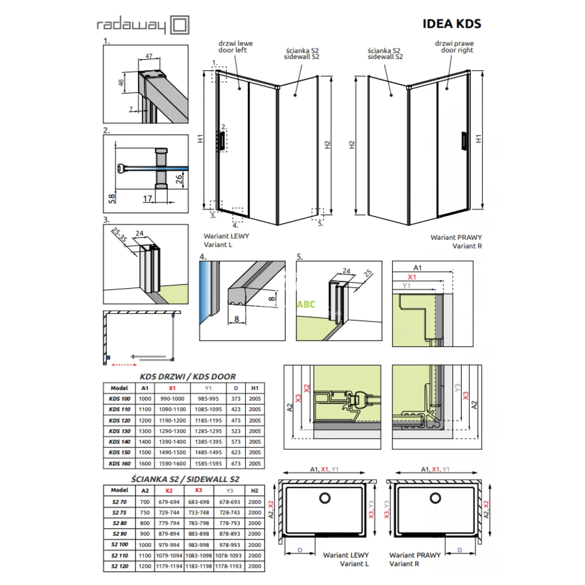 Uwaga! Wymiar kabiny dopasowany jest do montażu na brodziku o standardowym rozmiarze. W rzeczywistości kabina jest mniejsza. Jeśli planujesz montaż kabiny bezpośrednio na posadzce, zwróć uwagę na wymiary do osi szyby (Y1, Y2).