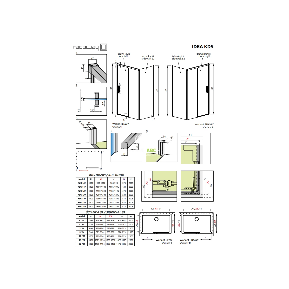 Uwaga! Wymiar kabiny dopasowany jest do montażu na brodziku o standardowym rozmiarze. W rzeczywistości kabina jest mniejsza. Jeśli planujesz montaż kabiny bezpośrednio na posadzce, zwróć uwagę na wymiary do osi szyby (Y1, Y2).