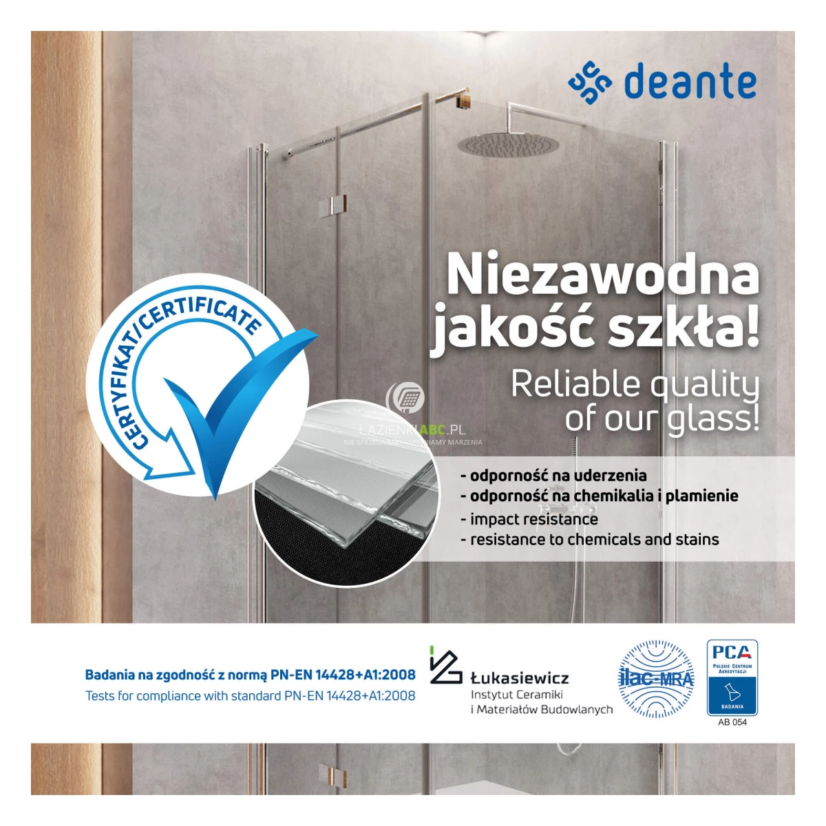 Szkło w kabinach Deante zostało pokryte innowacyjną hydrofobową powłoką Active Cover, która odpycha cząsteczki wody od powierzchni szyby nie pozwalając na ich osiadanie. Dzięki temu woda, a razem z nią mydło, brud i kamień spływają po powierzchni ścian kabiny natryskowej, nie pozostawiając na nich śladów i zacieków. Powłoka Active Cover jest scalana z szybą w procesie wytapiania szkła, co daje gwarancję długiej trwałości.